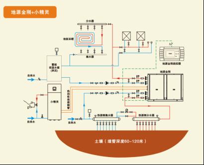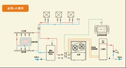 2、地源金刚机组提供制冷和制暖,小精灵提供生活热水,在制冷+热水模式运行下,地源金刚机组可实